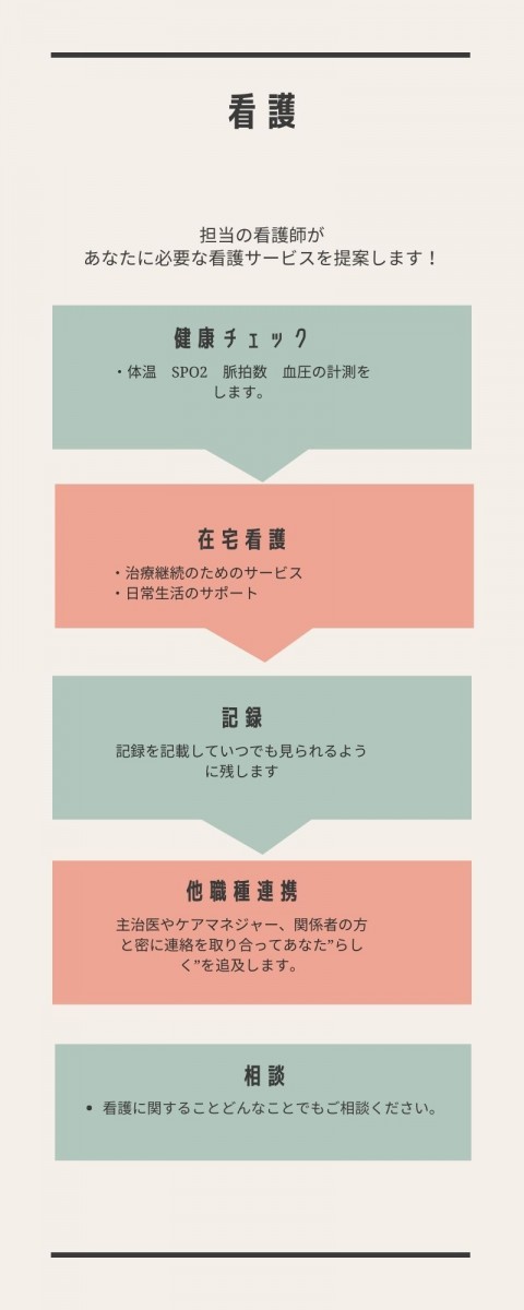 私たち”らしく”は、病気や障害を持った人が、住み慣れた場所でその人らしく生活を送れるよう、看護師などがご自宅に訪問してケアを提供するサービスです。