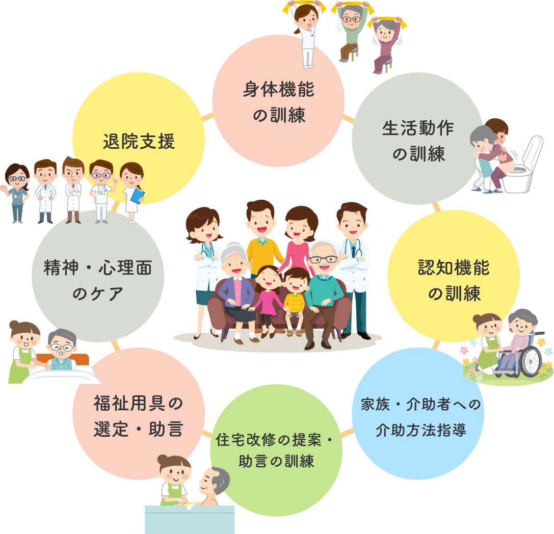 在宅生活に必要な運動機能や能力を維持・向上していく為に理学療法士、作業療法士、言語聴覚士等の専門職がご自宅にお伺いしリハビリテーションを行います。利用者様、ご家族様のご要望に応じ、また、医師の指示のもとプログラムを立案していきます。